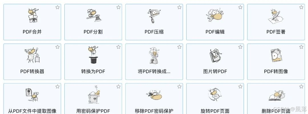 本软件许多与PDF处理相关的功能,每个功能都有一个可爱的卡通形象。这些功能包括PDF合并、PDF分割、PDF压缩、PDF编辑、PDF签名等。还有一些功能如PDF转换器、将PDF转换成其他格式、图片转PDF、PDF转图像等。此外,还有提取PDF页面、重新排列PDF页面、用密码保护PDF、移除PDF密码保护、旋转PDF页面、删除PDF页面等实用工具。还有一些高级功能,如PDF文本识别、添加水印、添加页码、查看PDF和其他文件、PDF叠加、比较PDF文件、优化PDF、注释PDF、对PDF文件标记密文、生成PDF等。