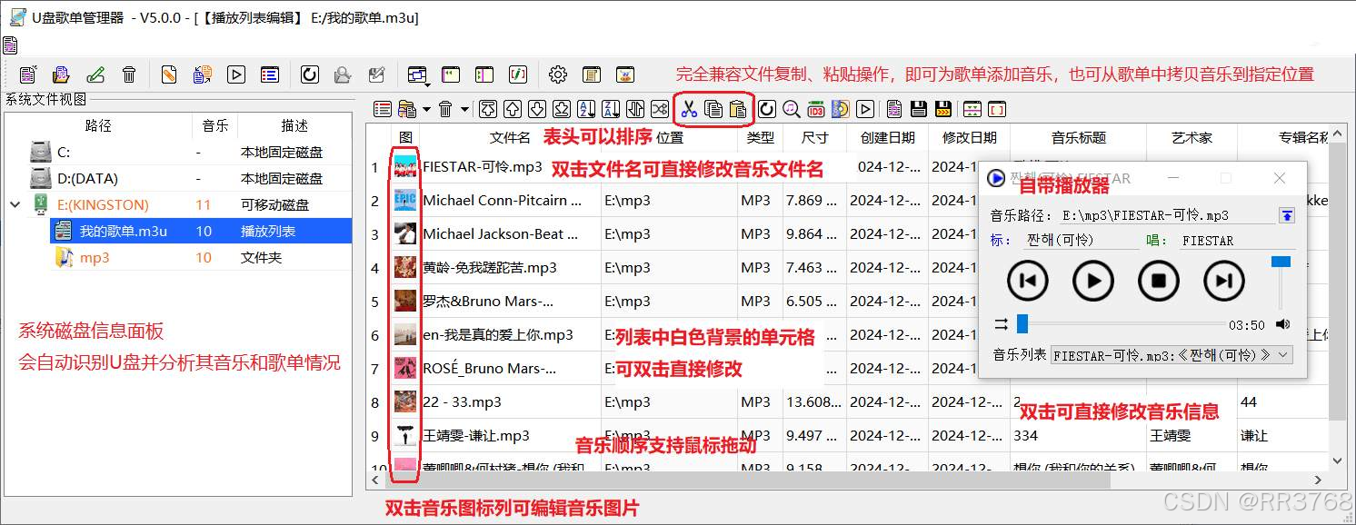 U盘歌单管理器也称U盘播放列表管理器,该工具主要为音乐U盘制作播放列表(也称歌单),特别适用于车载音乐U盘。能根据自己的喜好制作多个歌单,能更方便地根据心情享受不同的音乐!