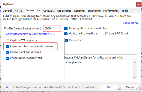 (1)启动Fiddler,在菜单选择“Tools -> Options -> Connections”,在“Connections”选项卡中,勾选“Allow remote computers to connect”,允许远程设备连接。