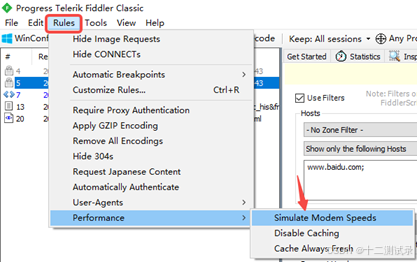 (1)配置好上述内容,来试一下效果,点击“Rules -> Performance -> Simulate Modem Speeds”,开启弱网。