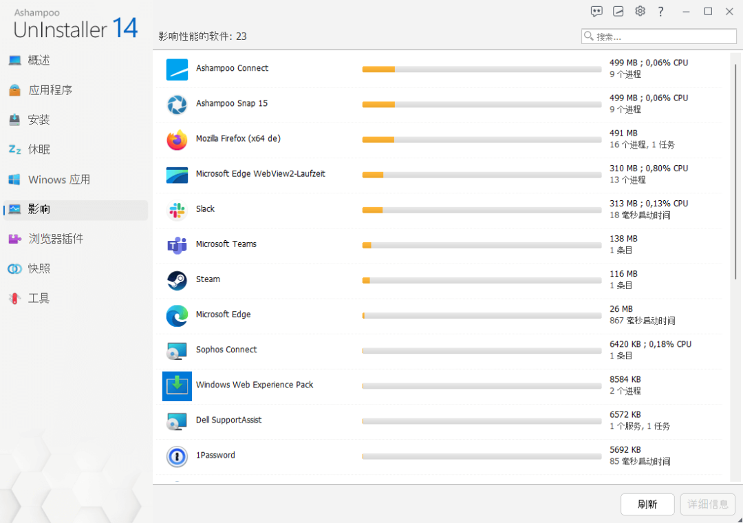 可以分析出影响系统性能的软件以及影响的程度。并且按照影响大小进行排序。