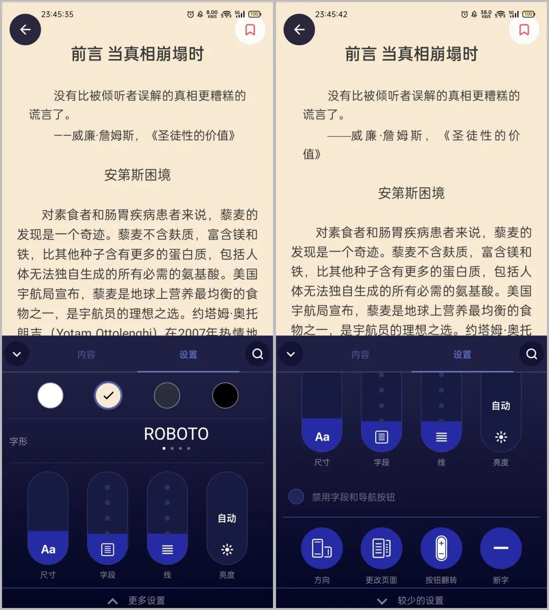 字体大小、背景、字形、字间距、行间距、亮度、翻页方向等均可根据自己的偏好调整。