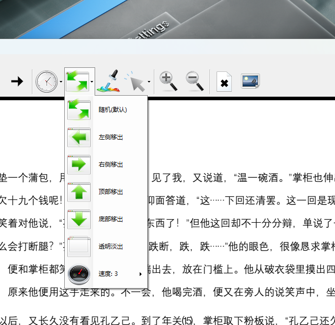 既然能充当powerpoint进行动画放映,那么动画切换自然也不再话下,有随机动画、左侧移出、右侧移出、顶部移出、底部移出、透明淡出等多种动画供你选择。