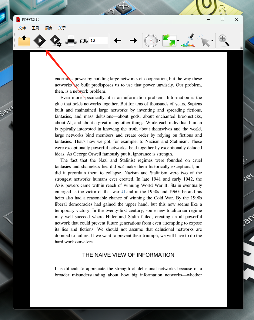 乍一看,软件与常见的PDF阅读器没啥区别,但实际上,软件左上角有一个放映按钮,点击一下即可进入PDF放映模式。