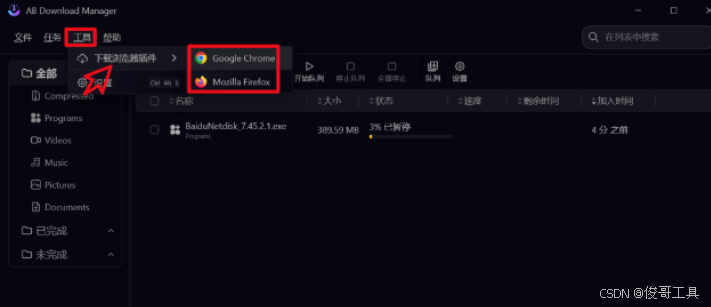 以前我推荐的那些下载器,要么只有客户端,要么没有插件功能。但这款软件太厉害了,客户端和插件都有,而且插件能支持谷歌和火狐浏览器。装上插件后,浏览器的下载功能就交给它了,一点下载链接,就会自动跳转到ABDownloadManager下载,和1DM的插件功能一模一样。
