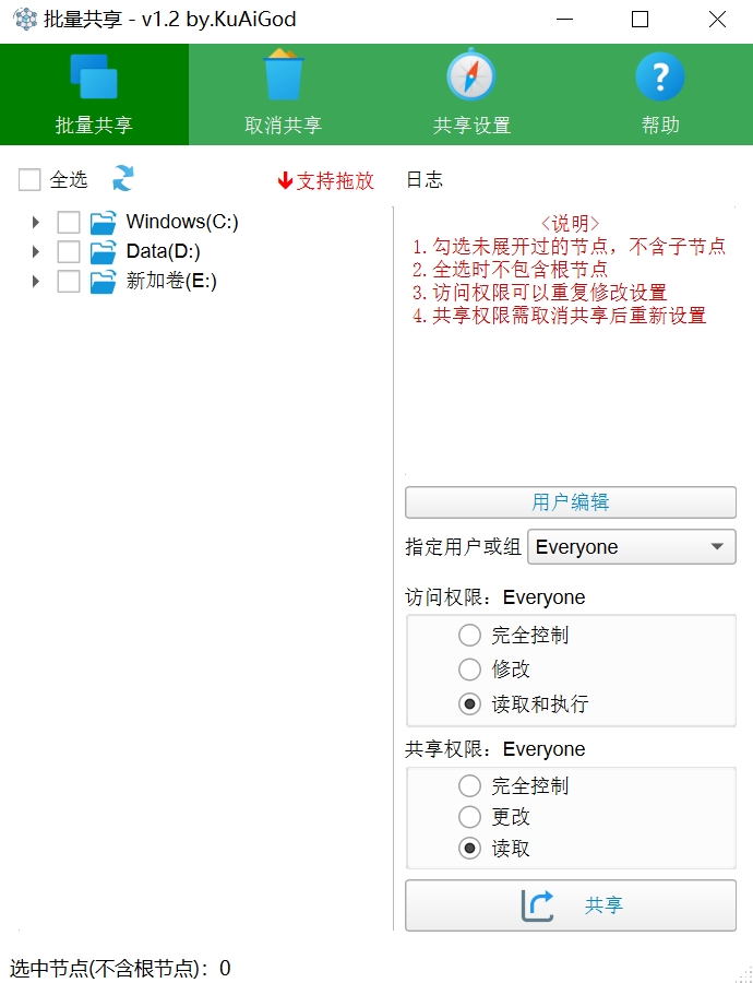 安利一款超级实用的批量共享软件,它能够一键批量设置文件夹共享,并灵活编辑共享及安全权限,让你轻松管理文件共享。 批量共享 一键批量共享文件夹 这款软件下载后直接打开即可使用,无需安装,方便快捷,节省时间和精力。
