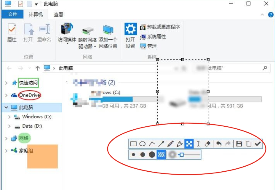 Snipaste 还可以快速标注界面元素,截图时选中矩形、椭圆、或者记号笔/马赛克/橡皮擦的矩形填充画笔,按下鼠标右键即可自动选中界面元素。