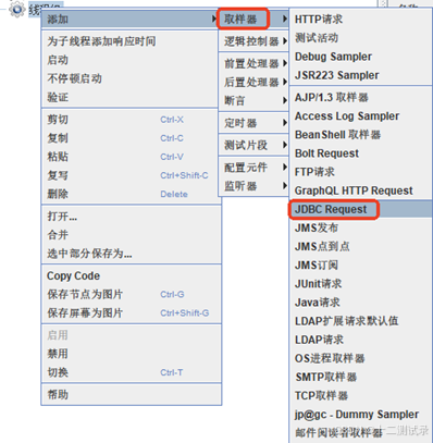 路径:线程组 -> 添加 -> 取样器 ->  JDBC Request