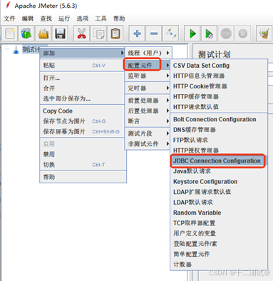 添加方法:线程组 -> 添加 -> 配置元件 -> JDBC Connection Confifiguration