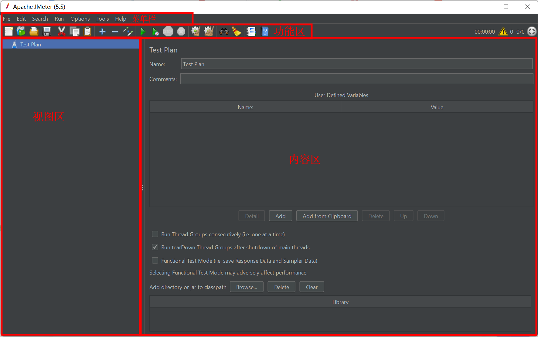 Jmeter面板一共分为4个区域,分别是菜单栏、功能区、视图区和内容区。