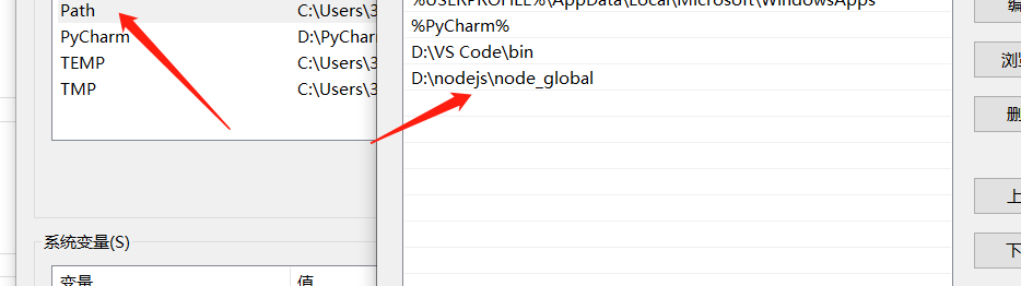 编辑用户变量里的Path,将相应npm的路径改为:D:\nodejs\node_global,如下: