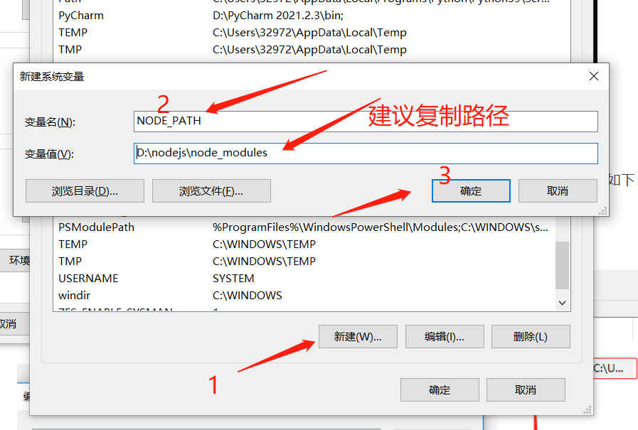 “NODE_PATH”, 值为“D:\nodejs\node_modules”,如下图: