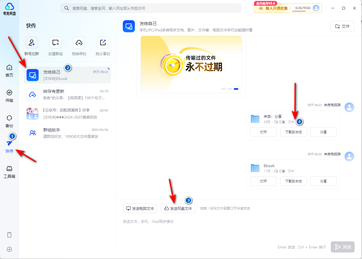 现在教你一个实用且免费的方法:用快传的方式,发给自己,然后下载即可