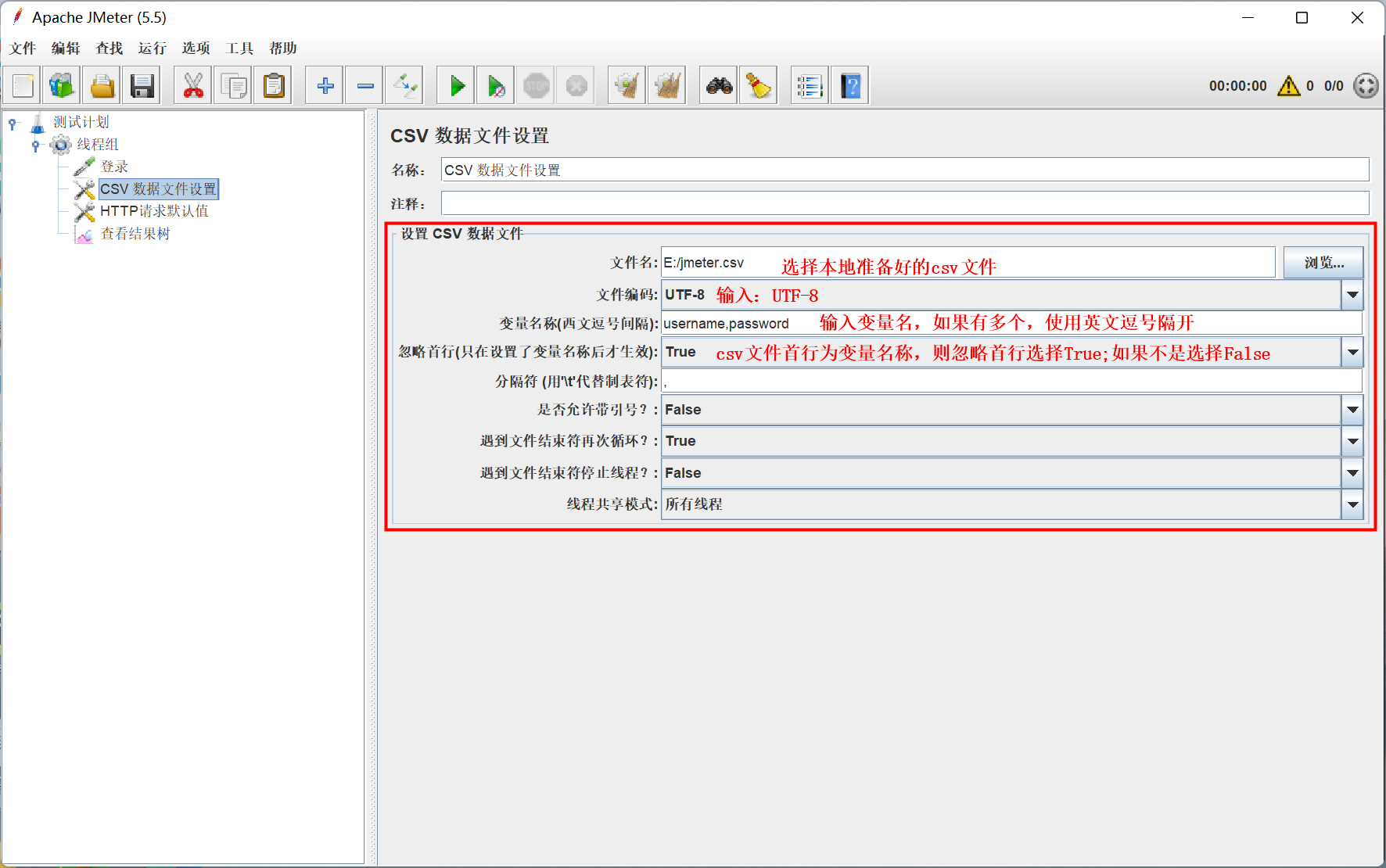 步骤一:在Jmeter中创建测试计划 --> 创建线程组 --> 添加 CSV Data Set Config 组件并配置 -->添加http请求并配置--> 添加查看结果树