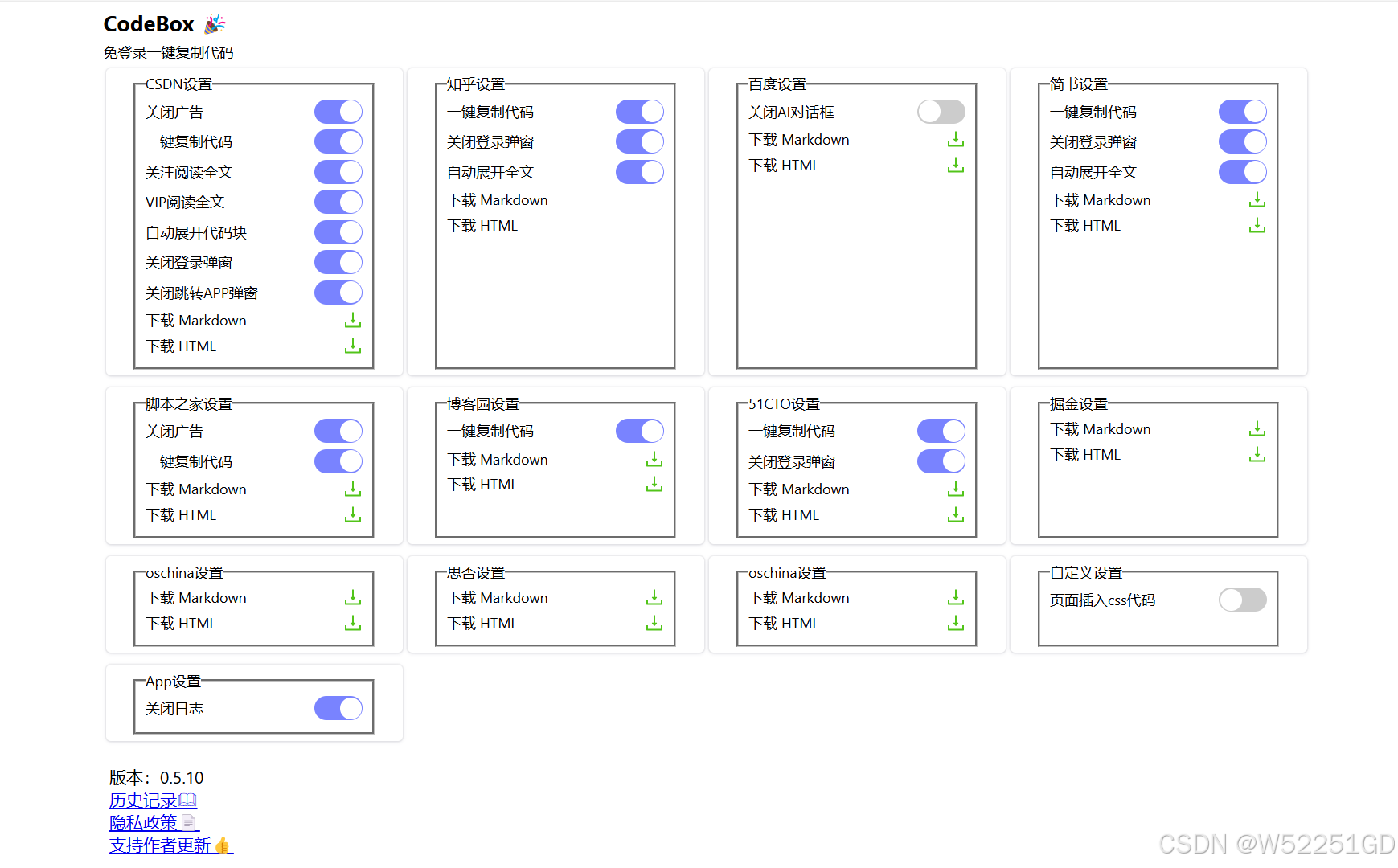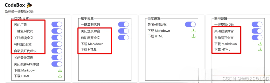 免登录复制代码:在一些需要登录才能复制代码的网站上,使用Codebox可以直接复制代码,无需登录。下载文章:支持一键下载文章内容,包括Markdown和HTML格式。解除复制限制:在一些限制复制的网站,如CSDN等,使用Codebox可以顺畅复制内容。支持多平台:适用于多个网站,包括CSDN、知乎、简书、脚本之家、博客园、掘金等。插件设置:安装后,可以在插件选项中查看和设置Codebox的主要功能。下载按钮:插件提供了下载按钮,方便用户直接下载文章内容到本地