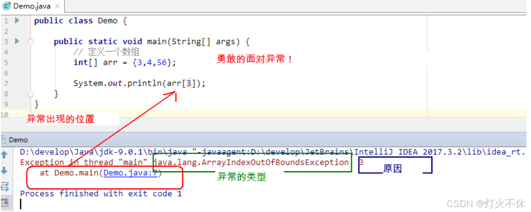 先运行下面的程序,程序会产生一个数组索引越界异常ArrayIndexOfBoundsException。通过图解来解析下异常产生的过程。