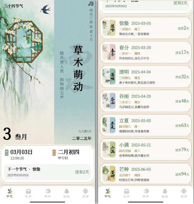 当您打开这款软件,瞬间就能被那充满“鸟语花香”的氛围所吸引,仿佛置身于自然之中,感受四季的更迭。这种独特的设计,让人眼前一亮。每个节气都被详细罗列,并且还搭配了优美的诗句,将中国传统文化展现得淋漓尽致,让人在查看日历的同时,也能领略到传统文化的魅力。