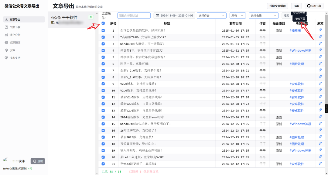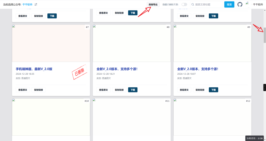 登录后系统会加载你公众号的文章,点击【数据导出】按钮,即可导出已加载的公众号文章。