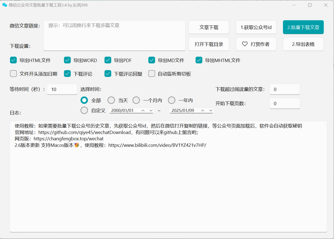 最后设置好下载的范围,是“全部”、“当天”、“一个月内”、“一年内” 也可以自定义范围,设置完成后点击【批量下载文章】即可