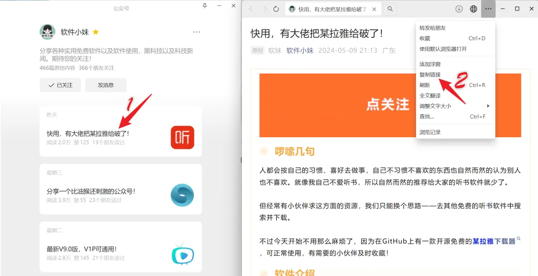 单篇文章的下载功能比较简单,我们先在PC端打开公众号,然后点击任意一篇文章,再“复制链接”