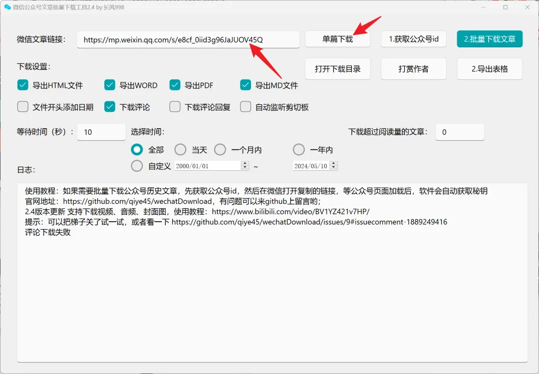 软件既支持单篇下载,也支持批量下载,因为操作方法都一样,下面我就不截新版本的图。