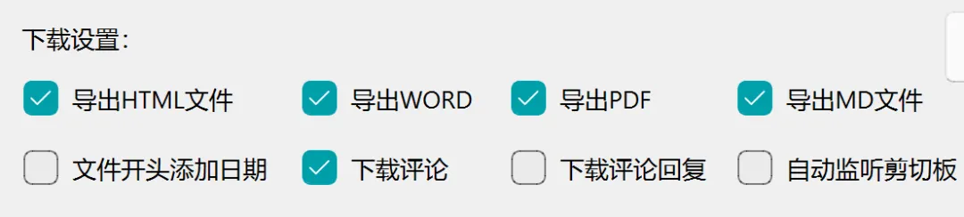 下载前我们可以在【下载设置】中进行相关设置,可以导出HTML文件、Word文件、PDF文件、MD文件,还可以在文件开头添加日期、下载评论、下载评论回复。