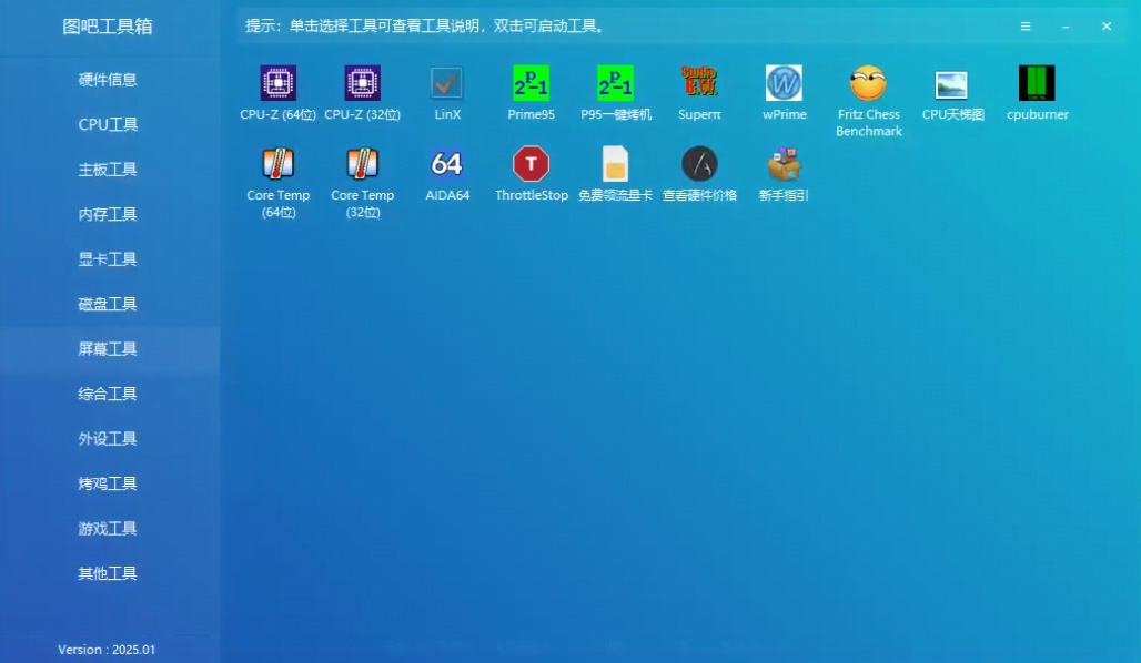 图吧工具箱(大家通常叫它图拉丁吧硬件检测工具箱)是一个完全免费、开源、没有广告的硬件检测工具集合。这个工具箱是专门为喜欢自己动手组装电脑(DIY)的朋友们,特别是图钉社区的成员们制作的。里面包含了好多常用的硬件测试和检测小工具,特别适合那些喜欢折腾电脑硬件的人。而且,这个工具箱里的所有功能都是免费的,没有任何限制。