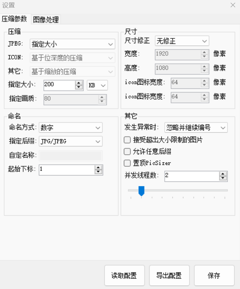 在开始压缩之前,我们还可以对压缩的图片进行个性化设置,可以设置压缩是指定大小,比如200K,也可以调整图片尺寸、修改命名方式等。