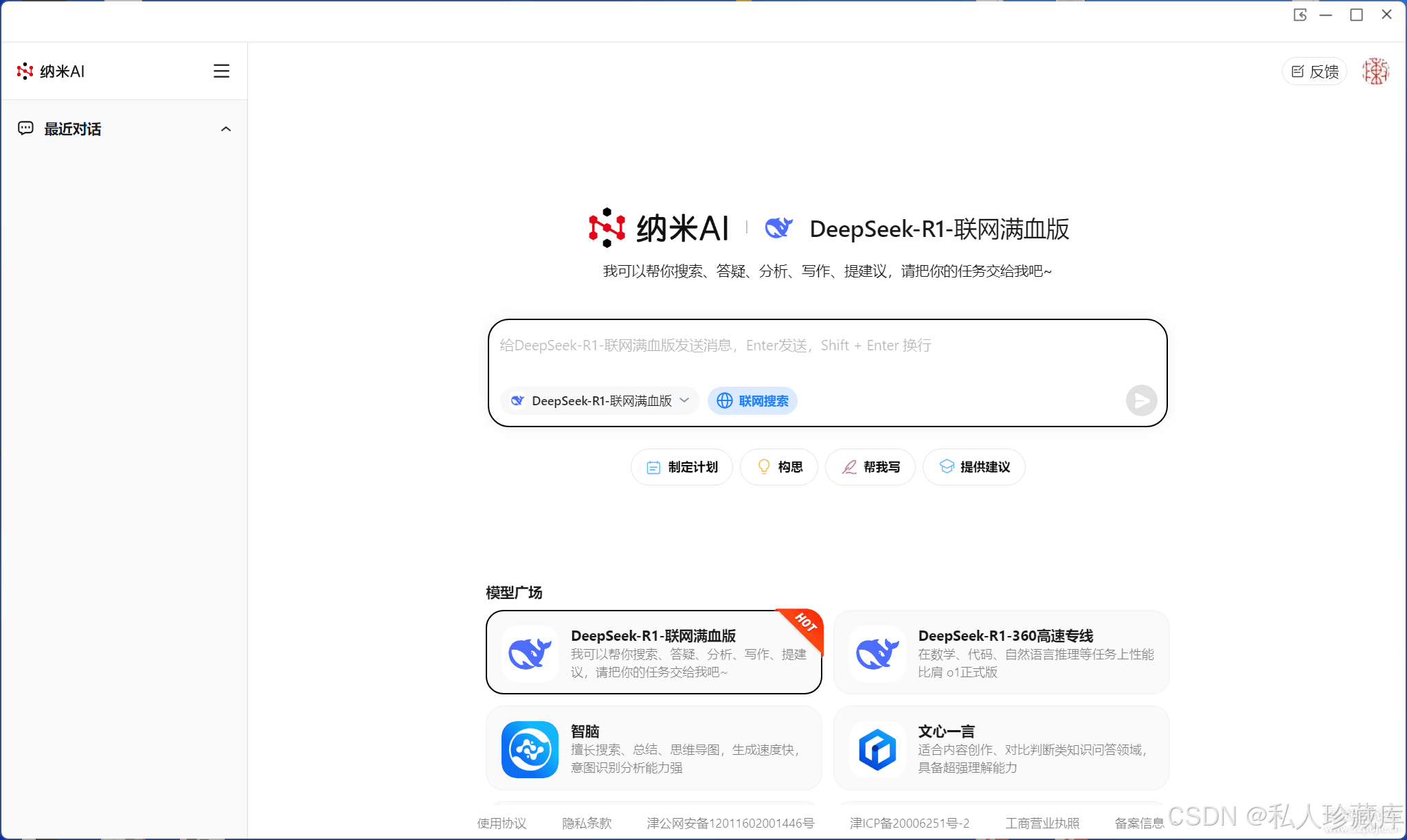 纳米AI桌面版,DeepSeek-R1-联网满血版无限用