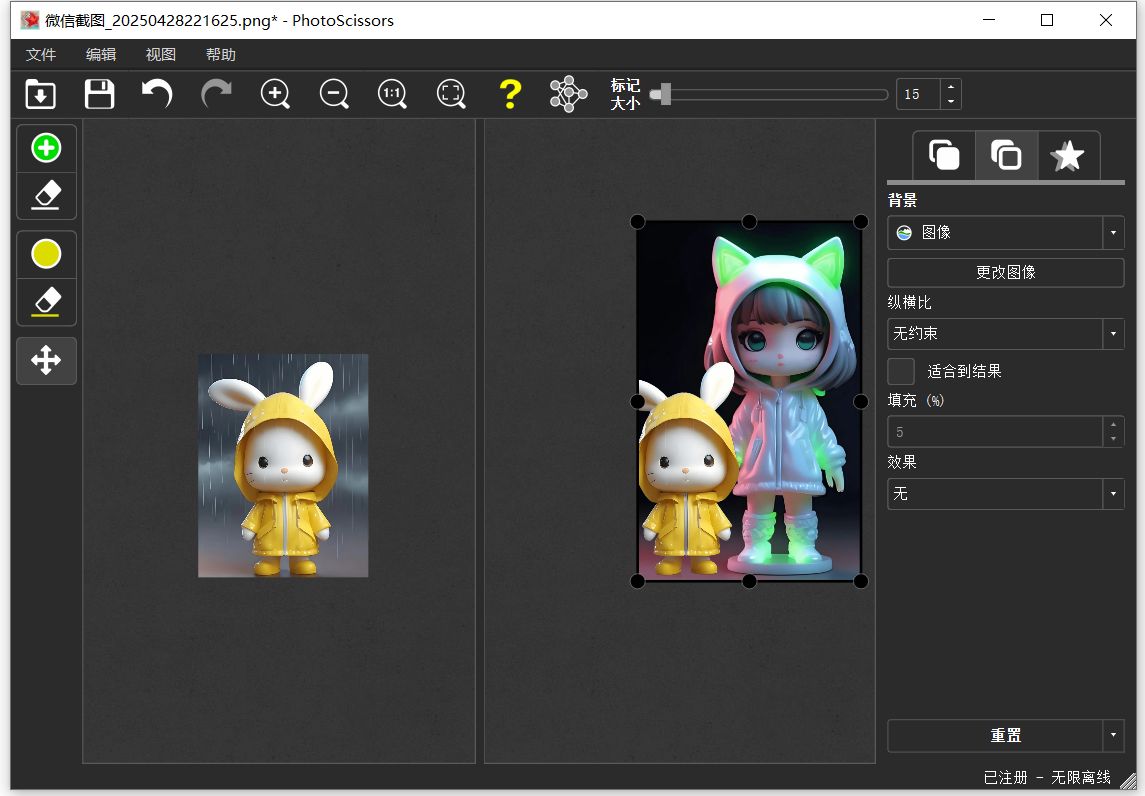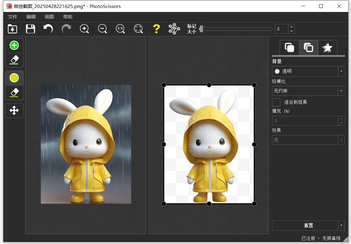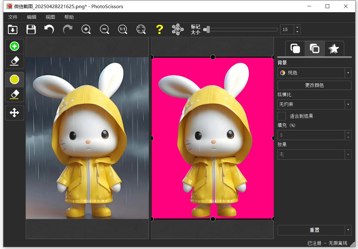 打开 PhotoScissors,将需要抠图的图片拖入软件界面,或者通过点击“打开”按钮选择图片。软件会自动识别图像中的主体,并尝试进行背景分离,效果还挺不错,比自己去标注前景和背景扣出来的好多了。如果自动抠图效果不太理想,别担心,用用左边的工具吧。绿色的“+”笔刷就像“魔法棒”,点一点你想保留的部分;红色的“-”笔刷则是“橡皮擦”,擦掉不需要的背景。要是边缘有点模糊,就用黄色笔刷标记一下,让边缘更自然。