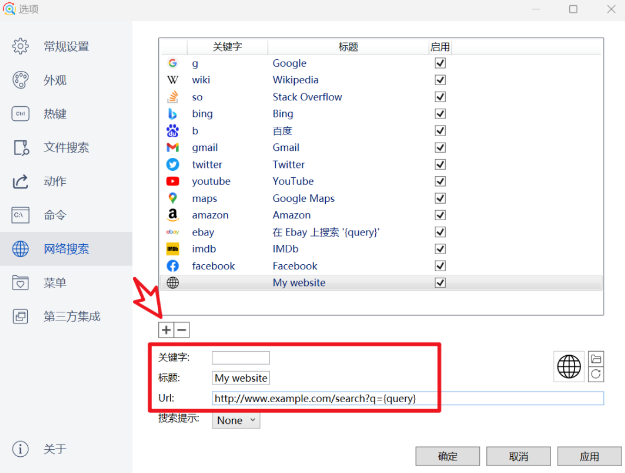 网络搜索功能更是强大,里面有各大搜索平台的搜索引擎,输入关键词就能直达相应平台。还能自己点击 “+” 添加搜索站点。