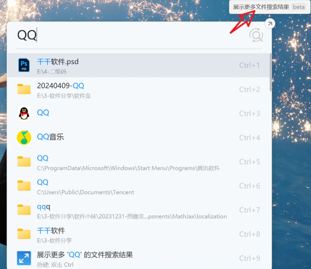 很多人用 Listary 时觉得搜索结果不全,其实这是误解!它只是优先展示了常用文件。点击右上角的按钮展开,就能看到全部结果,