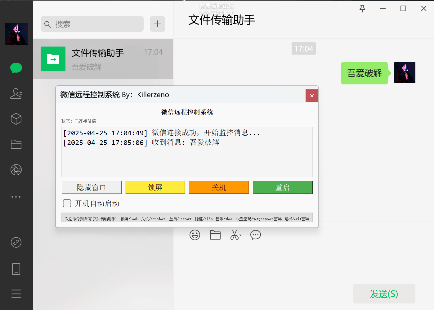 主要功能:通过监听微信文件传输助手聊天数据进行电脑操作控制,支持后台操作识别,无需聊天窗口打开,支持勾选自动启动选项,支持断线重连检测(无论是先打开软件还是先打开微信),支持自动输入查找文件传输助手(无视聊天列表有无文件传输助手),运行后绑定微信窗口默认(个别系统手机需要在微信传输助手里输入显示,以便显示工具窗口!!!)