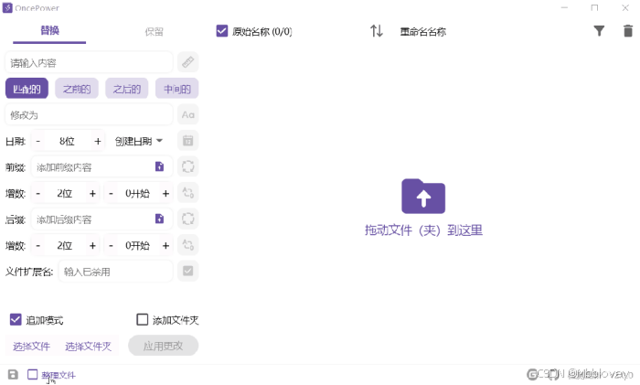 *OncePower* 是一个文件和文件夹批量重命名工具,额外添加了批量删除空文件夹和批量移动文件的功能,用户无需学正则表达式既可进行高级匹配。