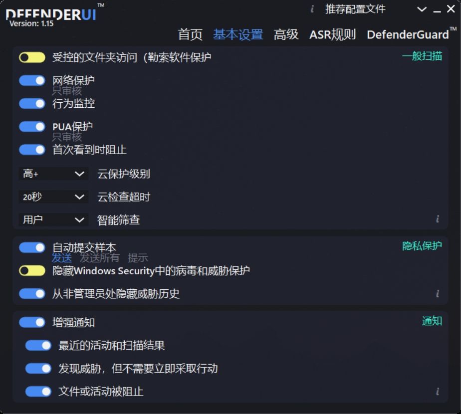 DefenderUI 提供了四种预设的配置文件模式,用户可以根据自身需求选择不同的安全级别,从基础防护到高级防护一应俱全。在基础设置中,用户可以快速启用或禁用多种保护功能,例如实时扫描、网络保护和勒索软件防护等。而在高级设置中,用户能够进一步调整扫描行为的细节,例如设置扫描优先级、优化 CPU 占用率,甚至排除特定文件或文件夹以避免误报。此外,DefenderUI 还支持多国语言,包括中文,确保全球用户都能轻松上手。它兼容 Windows 10 和 Windows 11 系统,并且在设计上始终以提升系统安全性为核心目标,而非削弱。