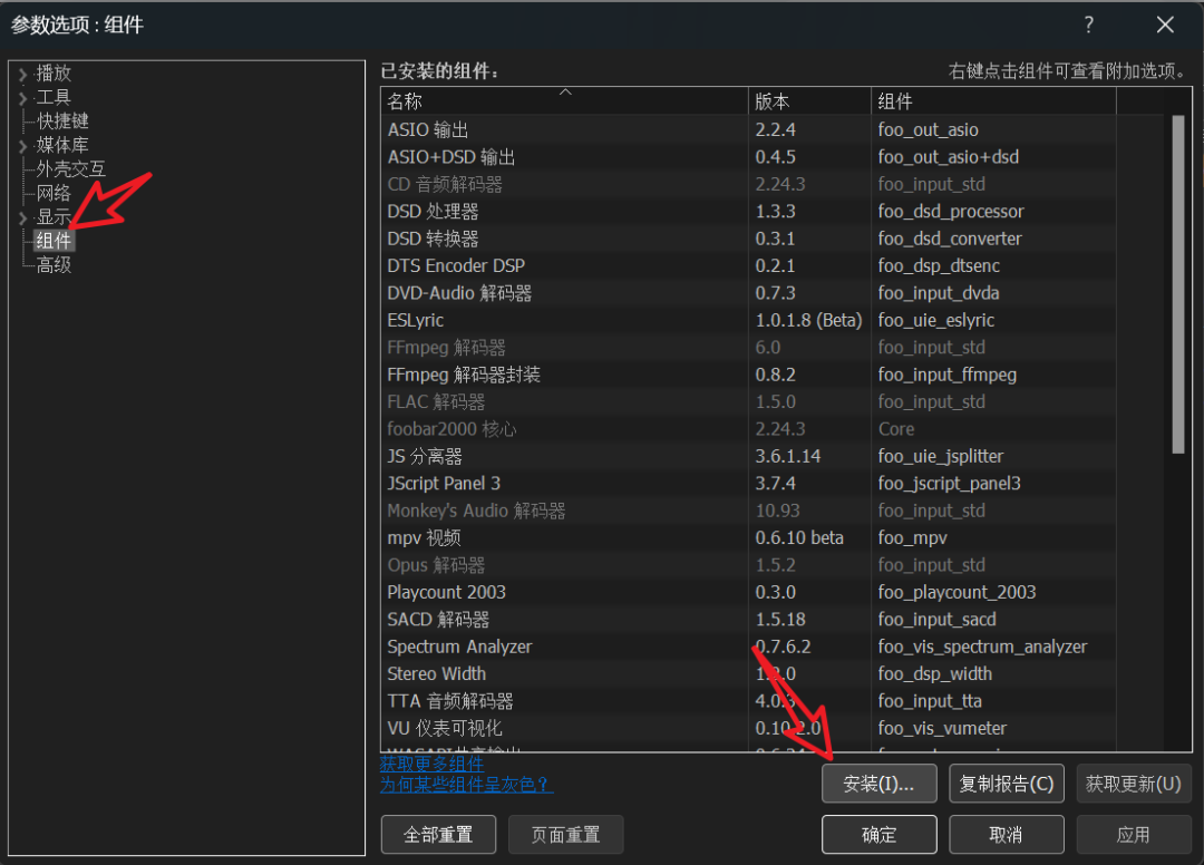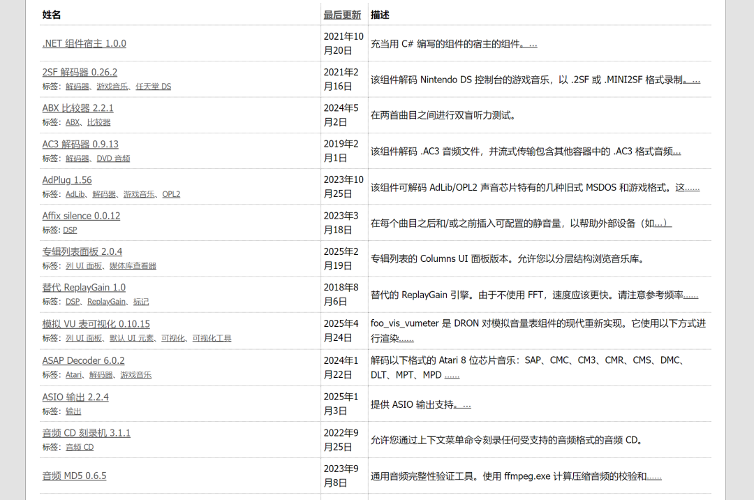 插件可以去官网:https://www.foobar2000.org/components下载。插件包括各种解码器、UI、增强播放等等。