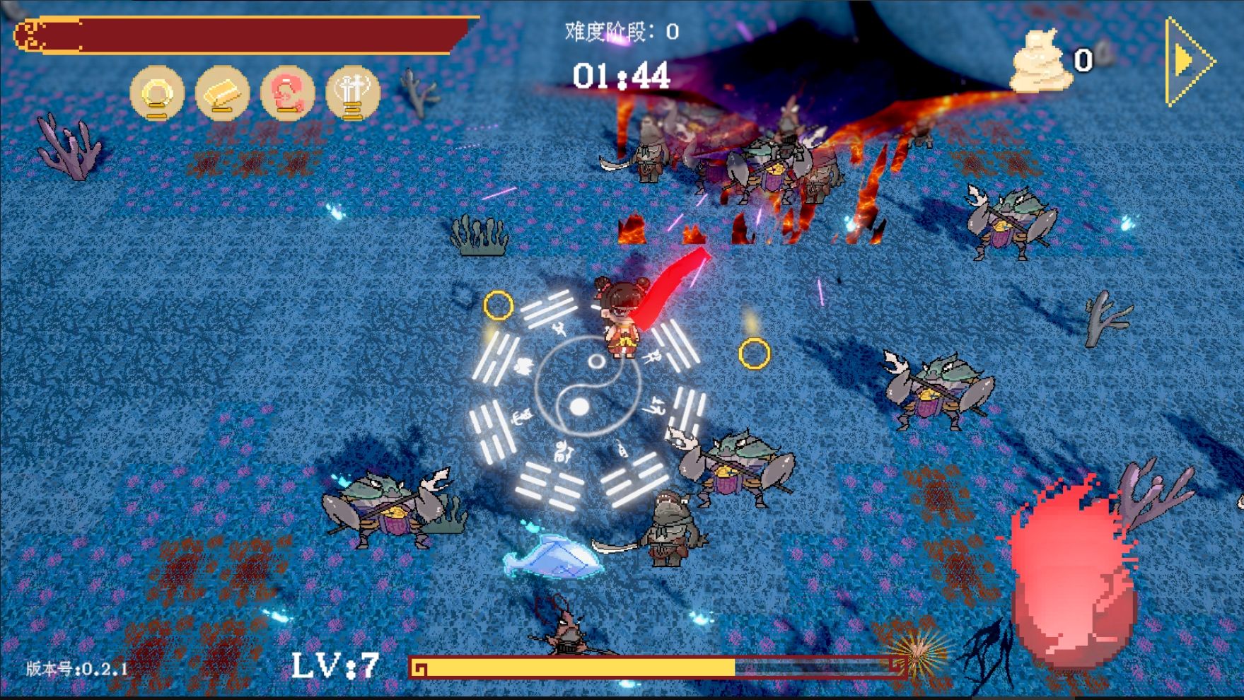 《黑神榜:哪吒》是由“火山哥哥”独立开发的非盈利同人游戏,改编自电影《哪吒之魔童闹海》。该作以像素风肉鸽割草玩法为核心,玩家扮演哪吒在随机生成的地图中使用乾坤圈、混天绫、火尖枪等经典法宝对抗海量怪物,并通过击杀敌人获取经验升级,每级可从三个随机法宝中选择其一强化,形成独特的技能组合。