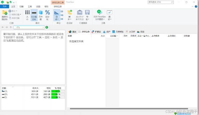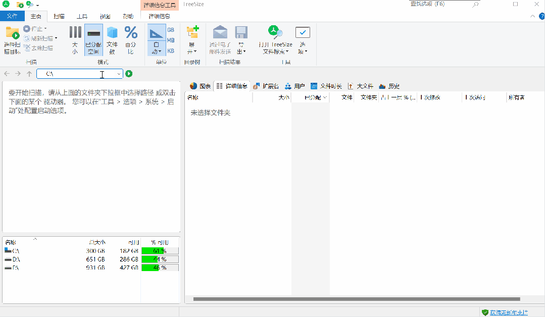 - **磁盘空间分析**:TreeSize 能够以惊人的速度分析磁盘空间的使用情况。只需选定您想要查看的盘符,点击运行,电脑磁盘空间的使用详情瞬间呈现。它通过图表、详细信息、扩展名、文件时长、大文件等多种直观形式,让您一目了然地知道到底是哪个文件或文件夹占据了大量存储空间。