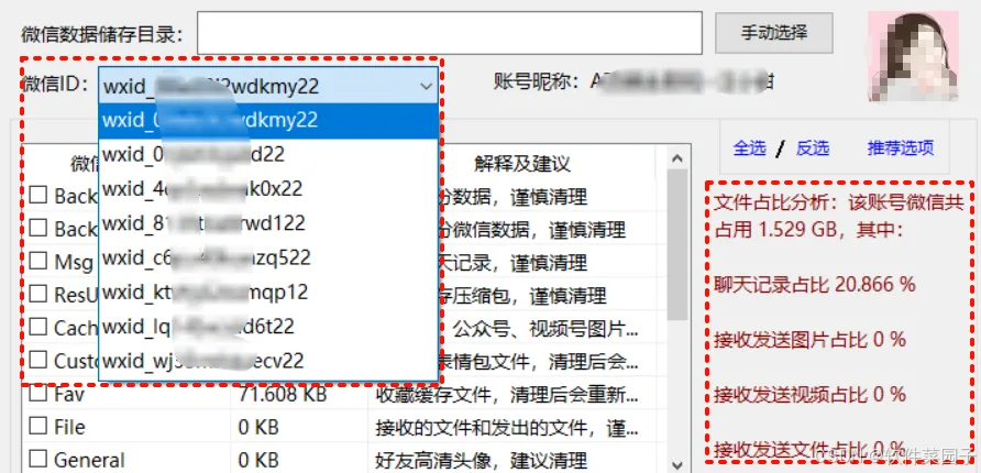 软件的清理选项非常详细,你可以自由选择。比如“手机备份微信数据”“全部聊天记录”“微信缓存压缩包”之类的。
