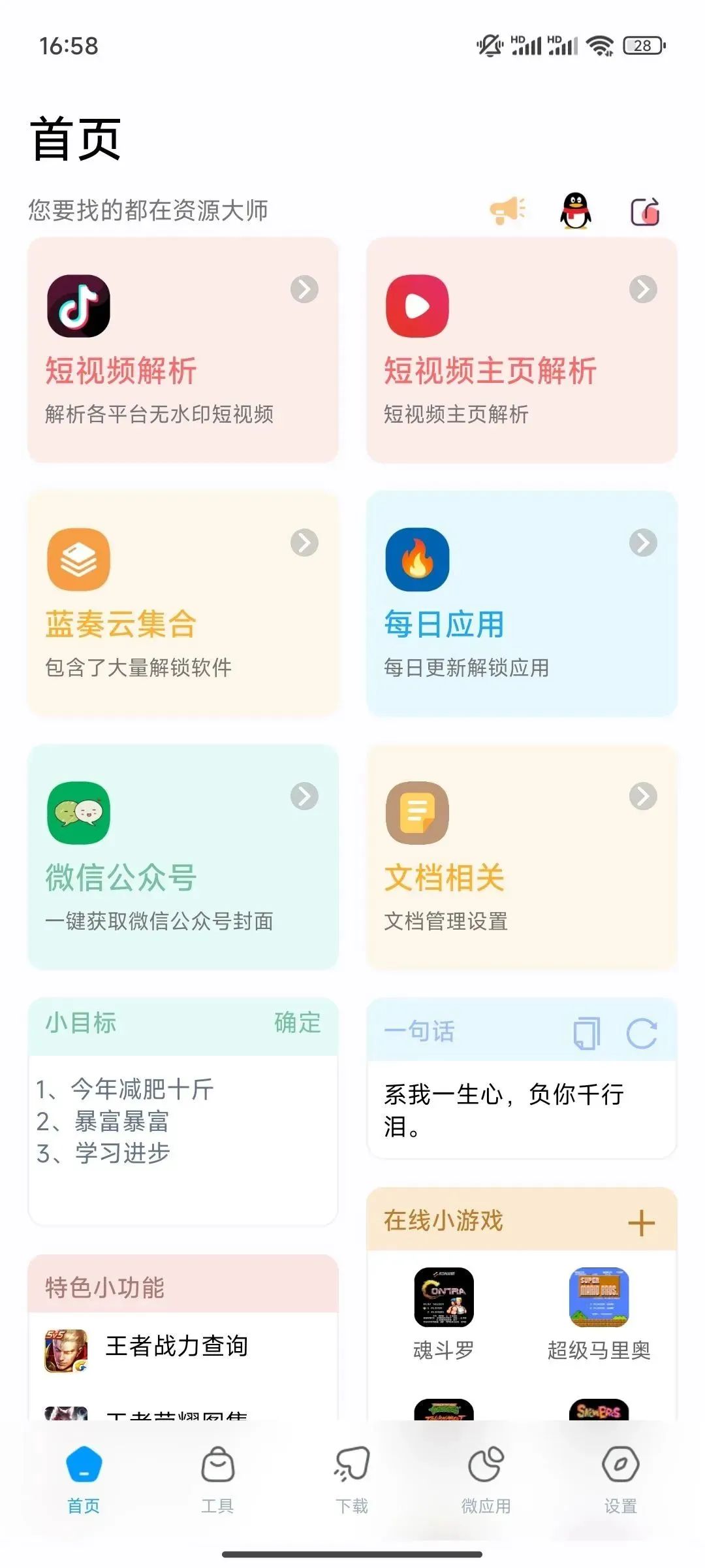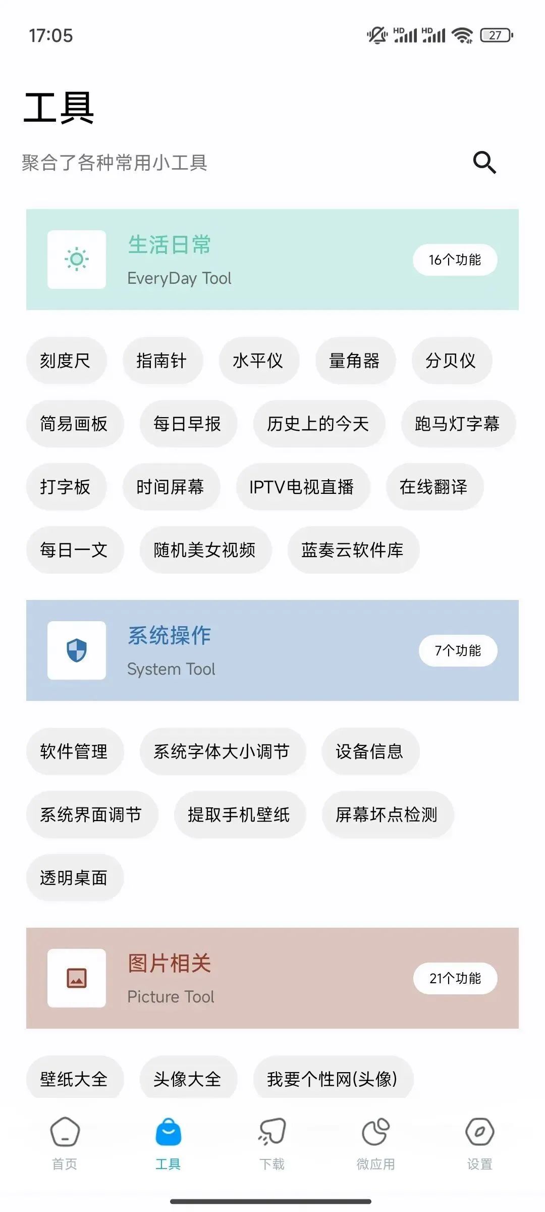 除了这些找资源的功能,软件内还有一些工具可以使用,有生活日常、系统操作、图片相关、查询搜索、资源提取、文字相关等七种分类。