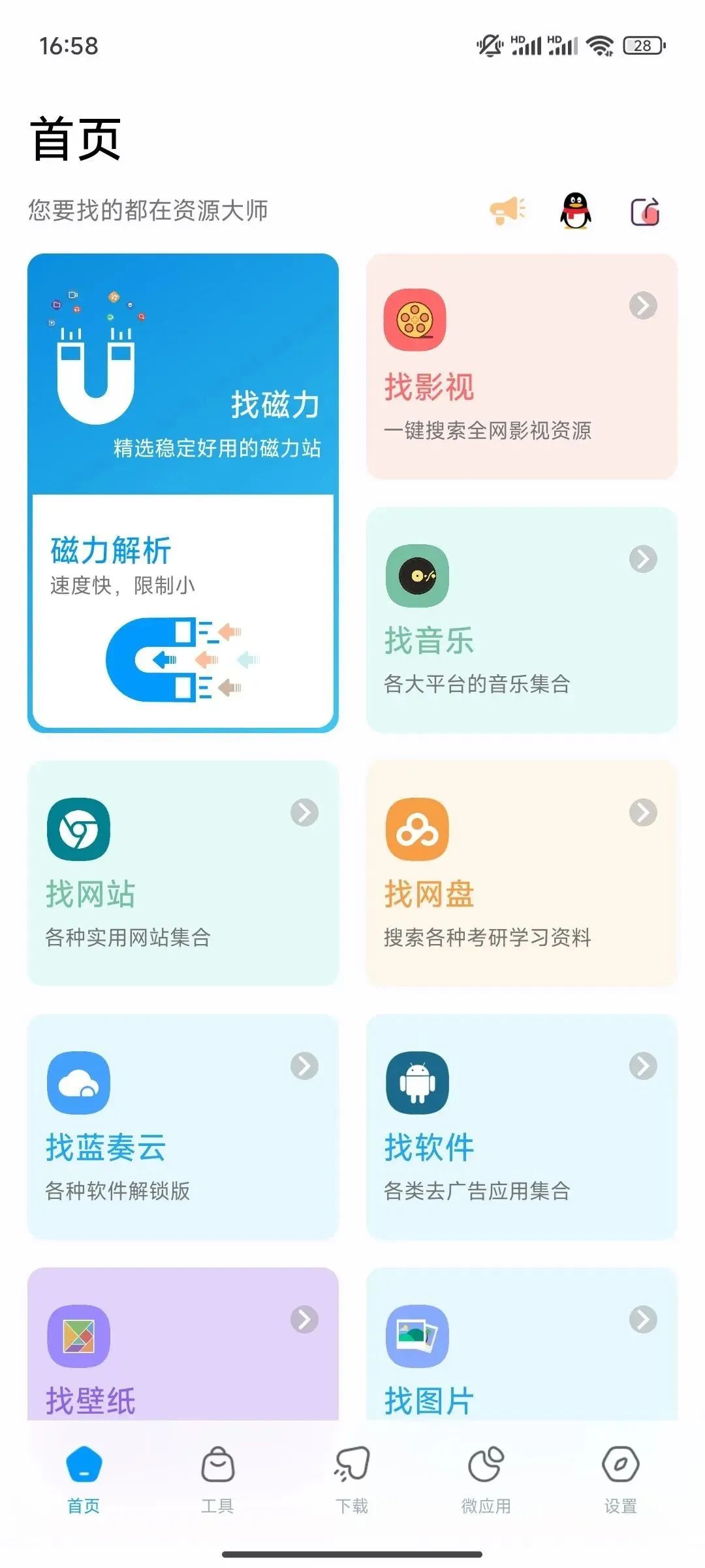 打开软件,在首页一直往下拉,可以看见软件的主要功能,有找磁力、找YS、找音乐、找网站、找网盘、找软件、找蓝奏云、找壁纸、找图片等等。