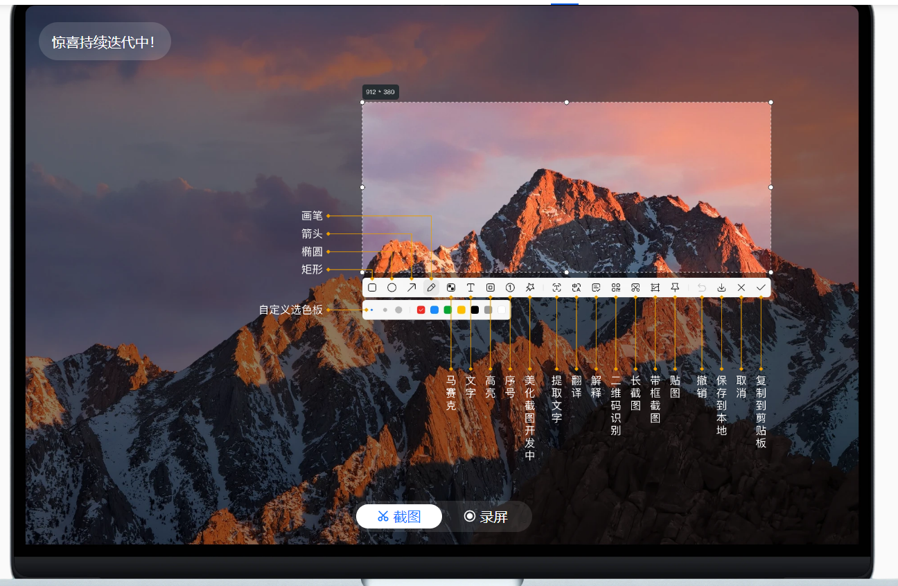 截图支持复制至剪贴板、画笔标注未内容、隐私涂抹等,自带翻译、识图解释、文字提取等功能,均为无需配置各种厂商 API 开箱即玩。至于录屏功能在此仅为附属品,过于简单且并未完善故不予赘述,仅针对GIF的录制算是绰绰有余,有需要来的推荐可请戳此款平替产品 > > 录屏工具 。