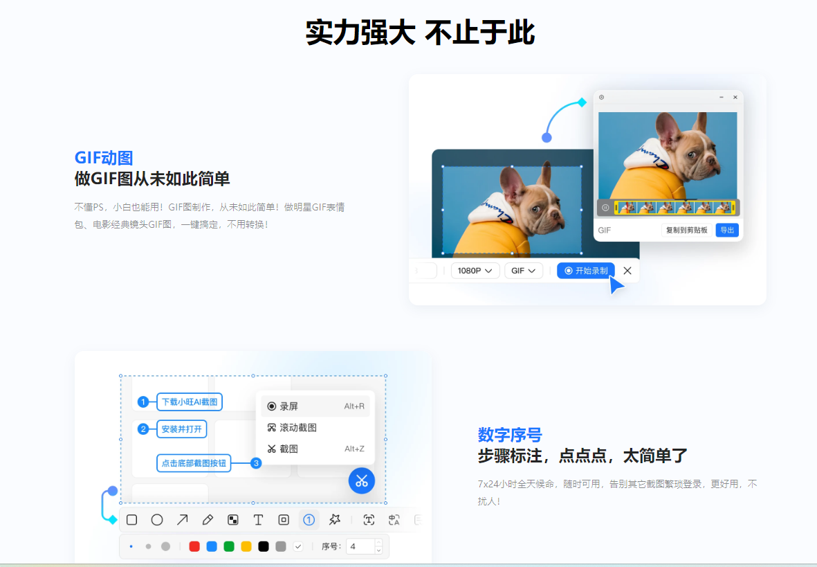 2.智能标注:序号自动生成+重点高亮,可始简易制作流程/步骤图【其中标注工具包包含箭头/画笔/文字框/色板/马赛克等20+标注元素の自由组合】。