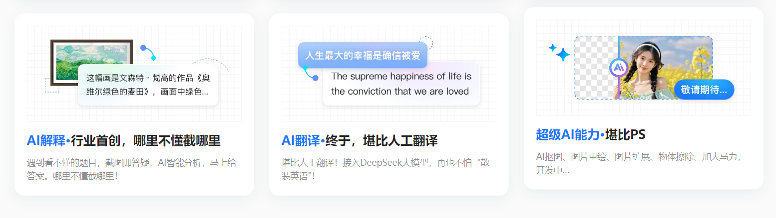 小旺 AI 截图(详情请戳 官网)是一款免费无广基于 DeepSeek算力的跨平台小巧多功能5智能截图和录屏工具。虽然2截图工具已经到处都是,但部分体验上破不尽人意,尤其是付费类工具。故各有各的优缺点,当然解此款也不例外,简洁又易用、无登录接口、无使用限制。支心持 Win 10 - 11 及 MacOS 10.15 + 以上的系统。近期更新,有需自取~~~