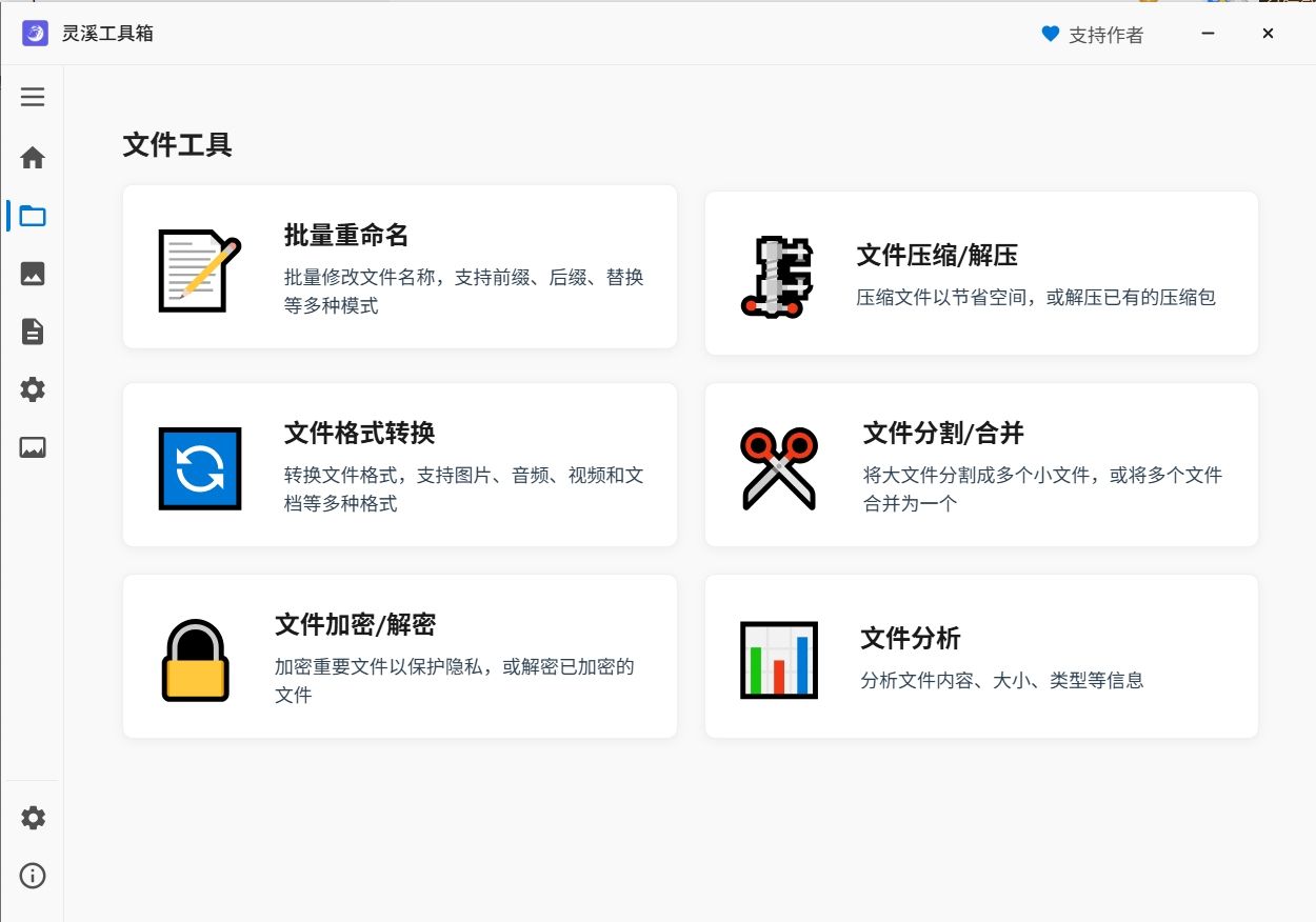 灵溪工具箱专为Windows平台设计,体积小到只有4MB左右,但功能却一点都不含糊。软件界面规划有文件工具、图像工具、文本工具、系统工具,目前先发布了文件工具的相关功能,它能帮你批量重命名文件,无论是添加前缀、后缀,还是用序号、正则表达式,都能轻松搞定。文件压缩、解压也不在话下,支持ZIP、TAR、7Z等多种格式。还有文件格式转换、分割合并、加密解密,甚至能读取文件详细信息,简直是个全能小助手!界面简洁,操作简单,新手也能秒上手,用它处理文件,效率直接拉满!