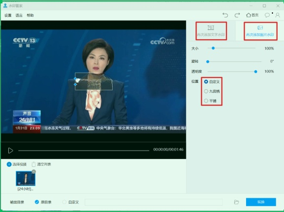 视频添加水印:可以添加文字水印或者图片水印,添加水印后可自由调节大小、旋转、透明度等,还可以设置九宫格或者平铺的方式。