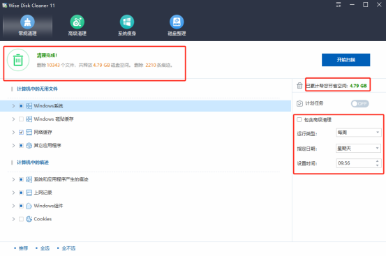 • 高级清理‌:自定义文件类型或路径,谨慎勾选需清理项(建议备份重要数据)‌。