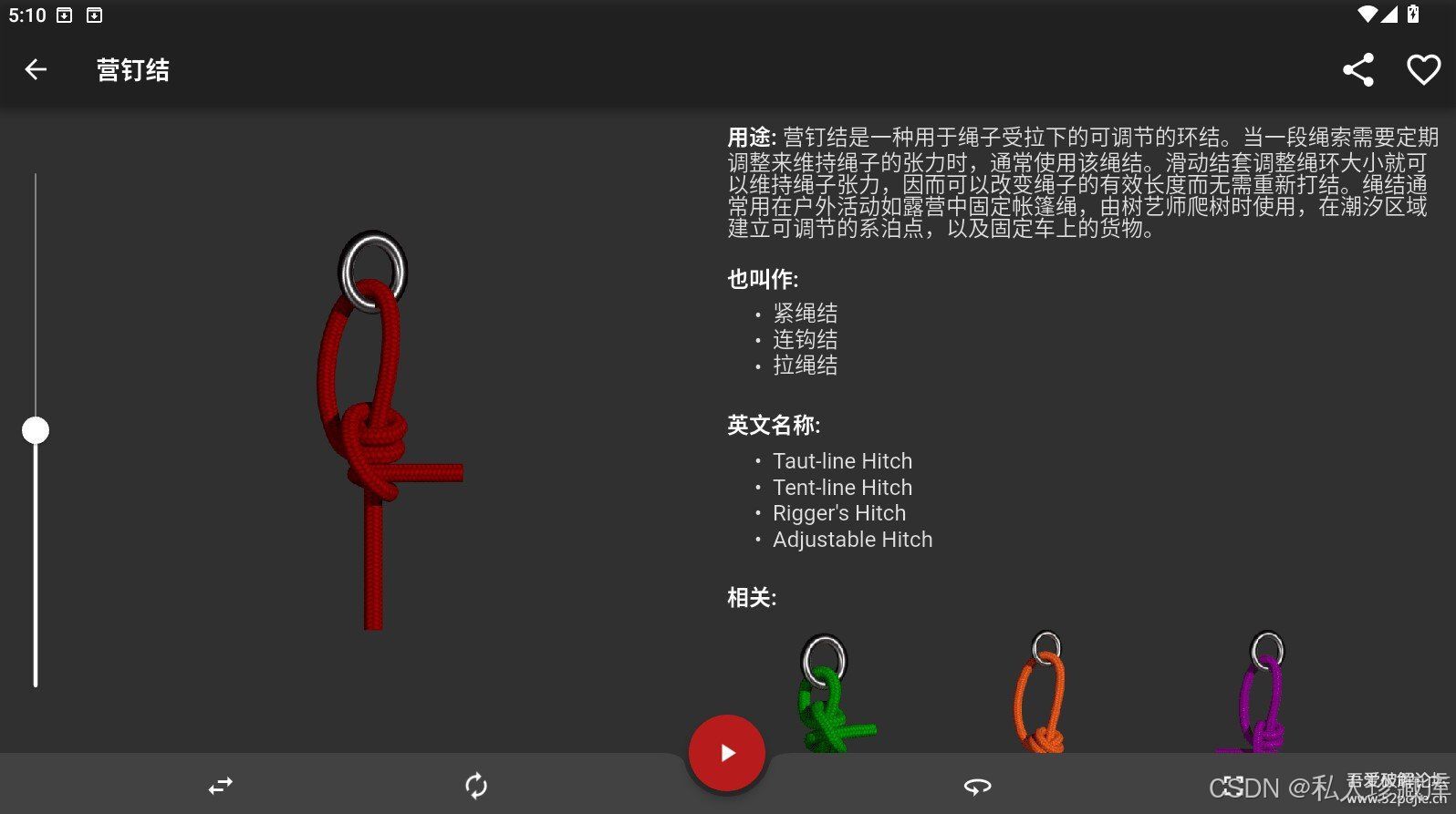 • 您可以观看打结本身,并且可以随时暂停动画或更改速度。