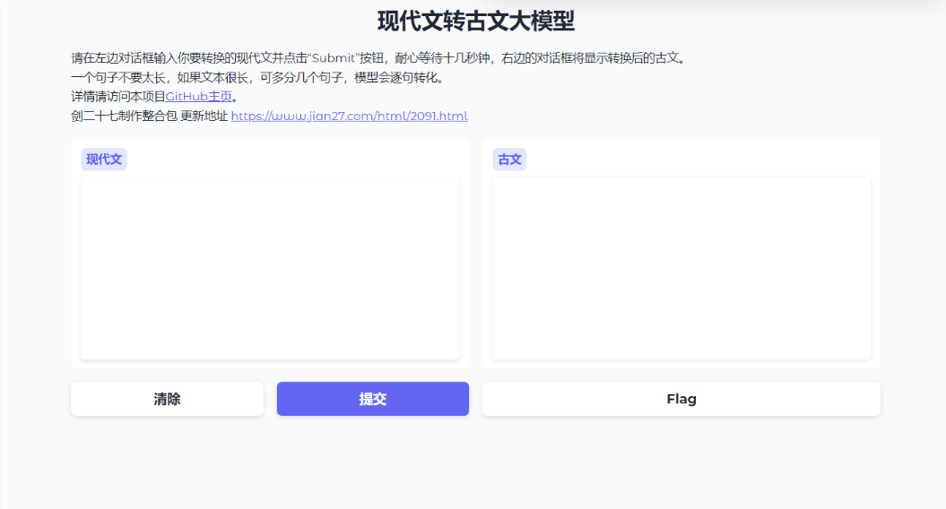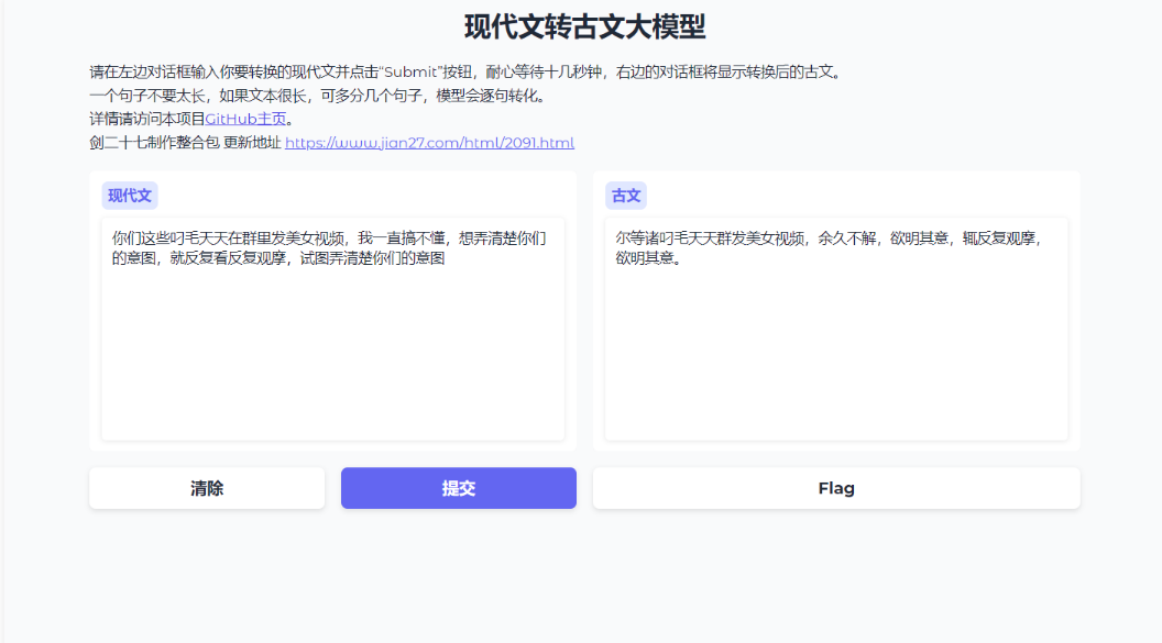 - 输入现代汉语句子,输出具有古汉语风格的句子。这一功能不仅保留了原句的意思,还赋予了文本古朴典雅的韵味。