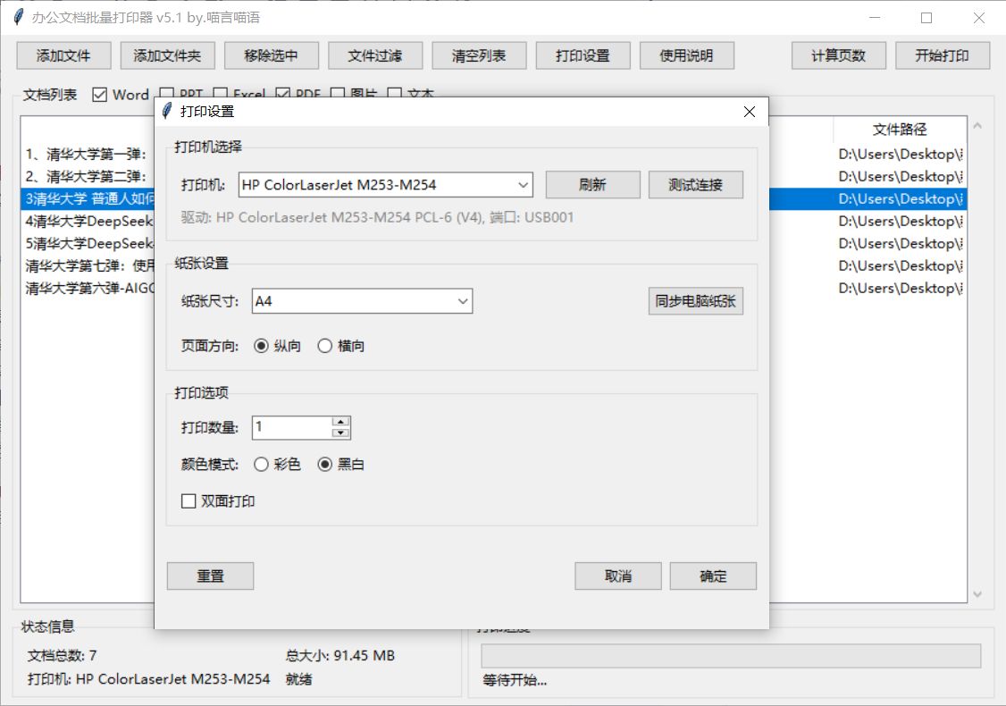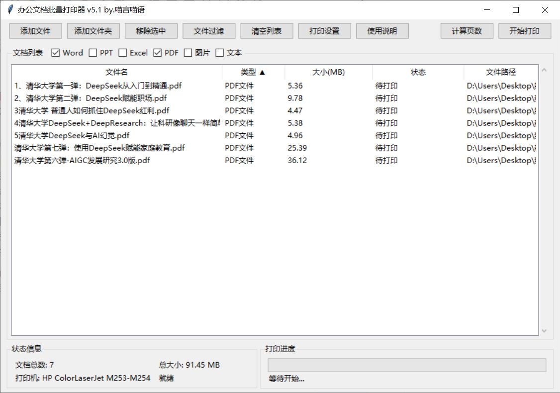 这个工具简直就是为咱们这些办公族量身定制的。它支持的文件格式可丰富了,Word、Excel、PowerPoint、PDF,还有各种图片格式,统统不在话下。不管你是要打印报告、报表,还是图片资料,它都能轻松搞定。操作起来更是简单到飞起,直接把文件拖拽进去,或者点点鼠标添加文件夹,它就能自动开始打印啦。而且,它还能根据文件类型快速筛选,你想打印哪种类型的文件,它就能精准地帮你挑出来,再也不用在一堆文件里翻来翻去啦。打印设置也超灵活,双面打印、彩色黑白切换、纸张大小调整,这些都能轻松设置,满足你各种各样的打印需求。最贴心的是,它还能统计页数、实时监控打印进度,让你对打印情况一目了然。